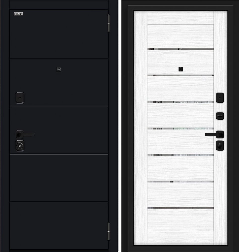 Надежная входная Дверь Браво Прайд Total Black/Snow Melinga премиум класса по цене 39 669 руб. Большая толщина стали защитит от проникновения в ваш дом, квартиру или коттедж. Используется очень качественная фурнитура: замки, цилиндры, ручки, защелки. Покрытие и отделка двери изготовлено под внимательным контролем производителя. Дверь имеет долгий срок службы и гарантию.